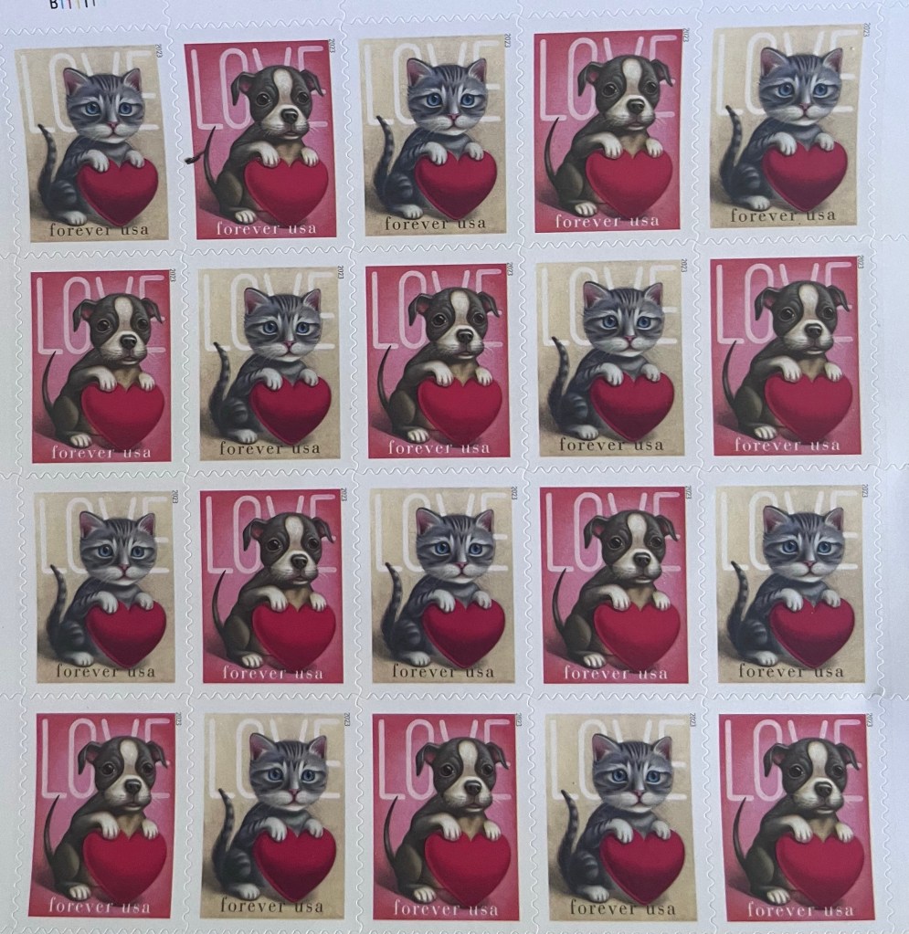 Later in the day, I walked up town to pick up my work mail, and bought some stamps. And not just any stamps but Valentine’s Day stamps.