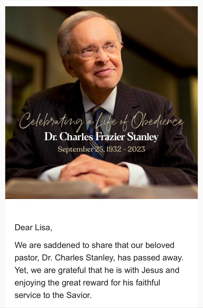 Today a dear servant of God has passed, Dr. Charles Stanley.My heart is broken yet I am smiling, thinking of him being with Jesus.